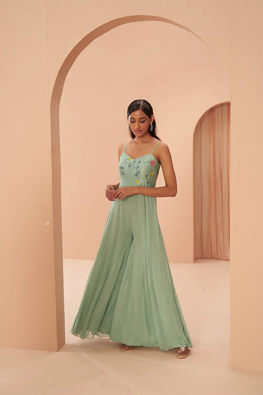A jumpsuit made with pure love ,featuring beautiful details of floral hand paint on the bodice.