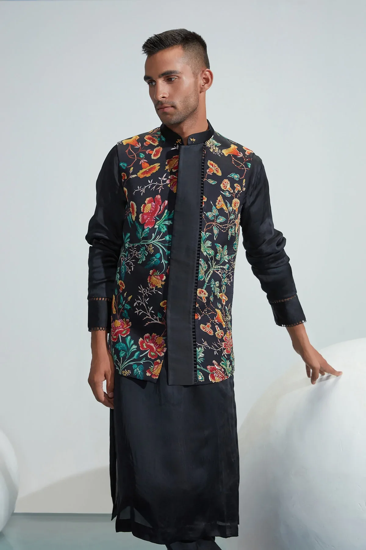Black satin organza embroidered bandi, satin organza black kurta and churidaar set