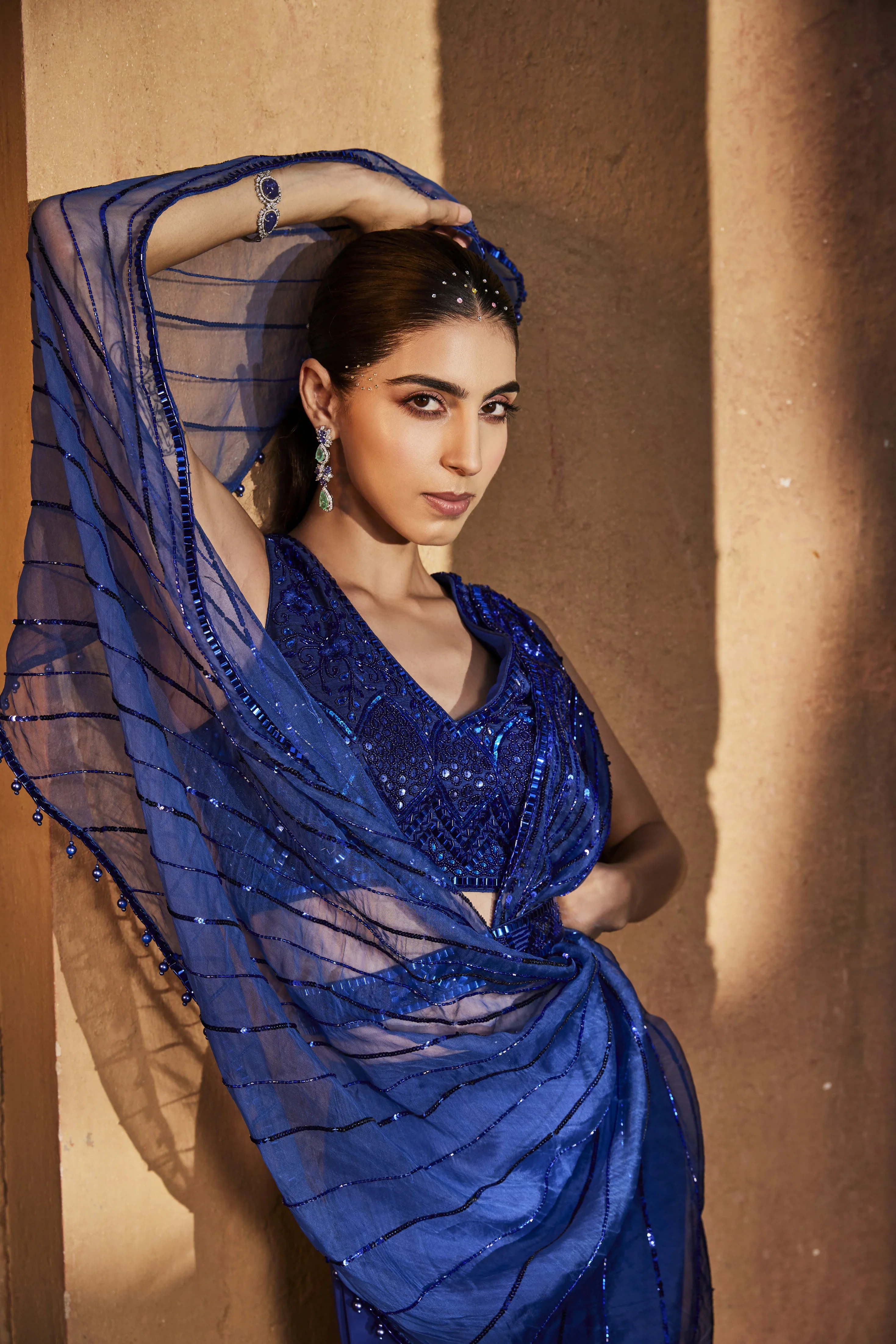 Blue embroidered choli with attached organza drape paired with sharara pants and an embroidered belt.