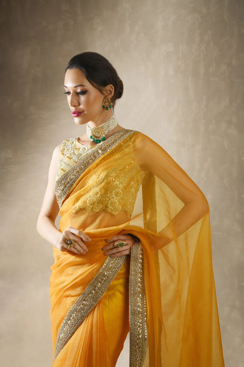 This set features a organza mango sari set. The organza with rich gold zari & sequin border drapes beautifully in a elegant sari. It is teamed with the classic Renee label mirror work blouse with sheer back & front neck. The net blouse is embellished with dori, mirrors, & beads with sequin sheathed bustier.