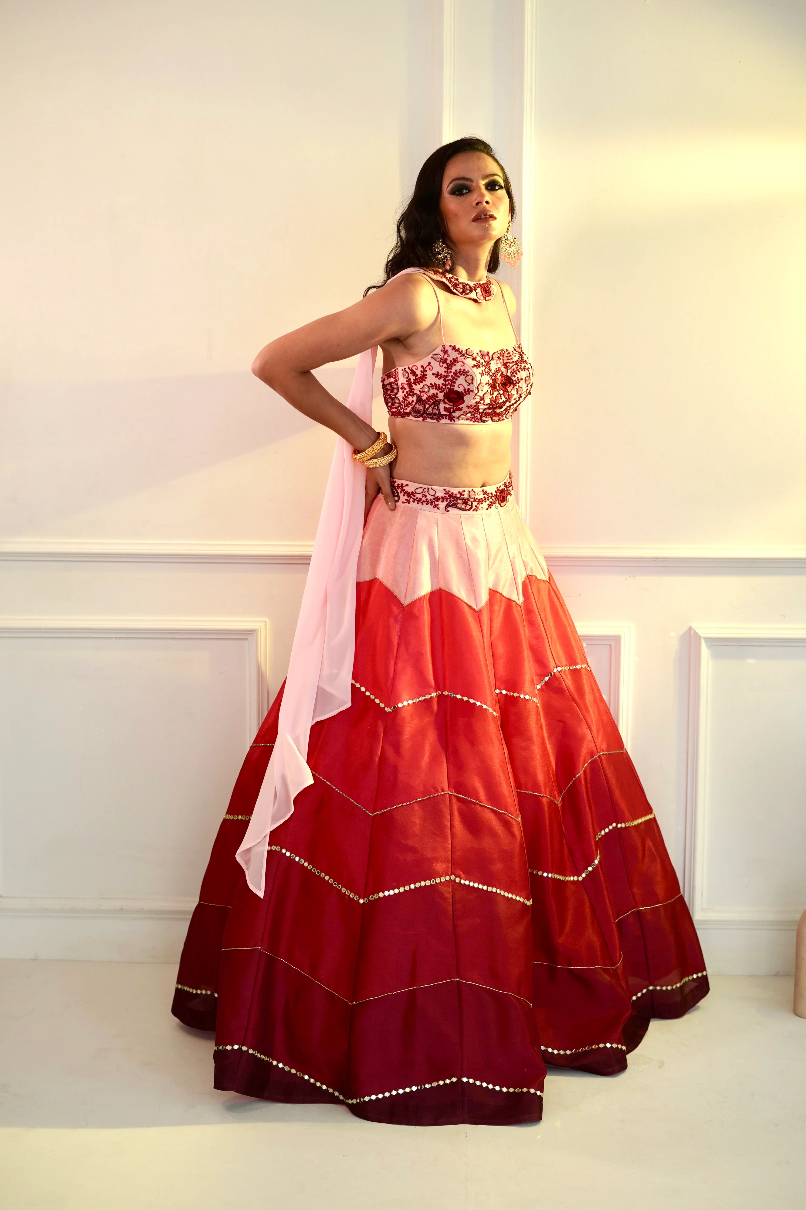Chiffon Bustier paired with Ombre Silk Lehenga and Our Signature Choker Dupatta