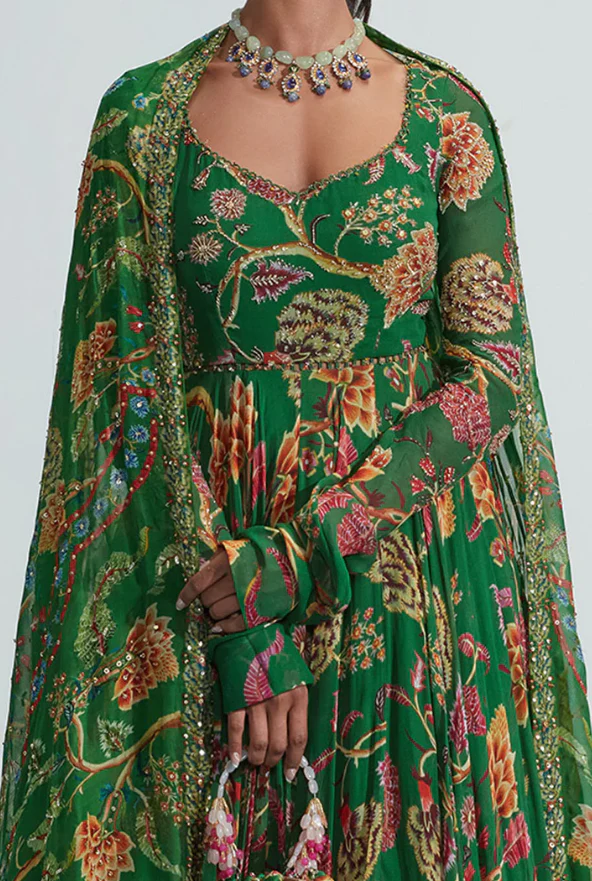 Green georgette embroidered anarkali and embroidered organza dupatta with tassels hem detaling set
