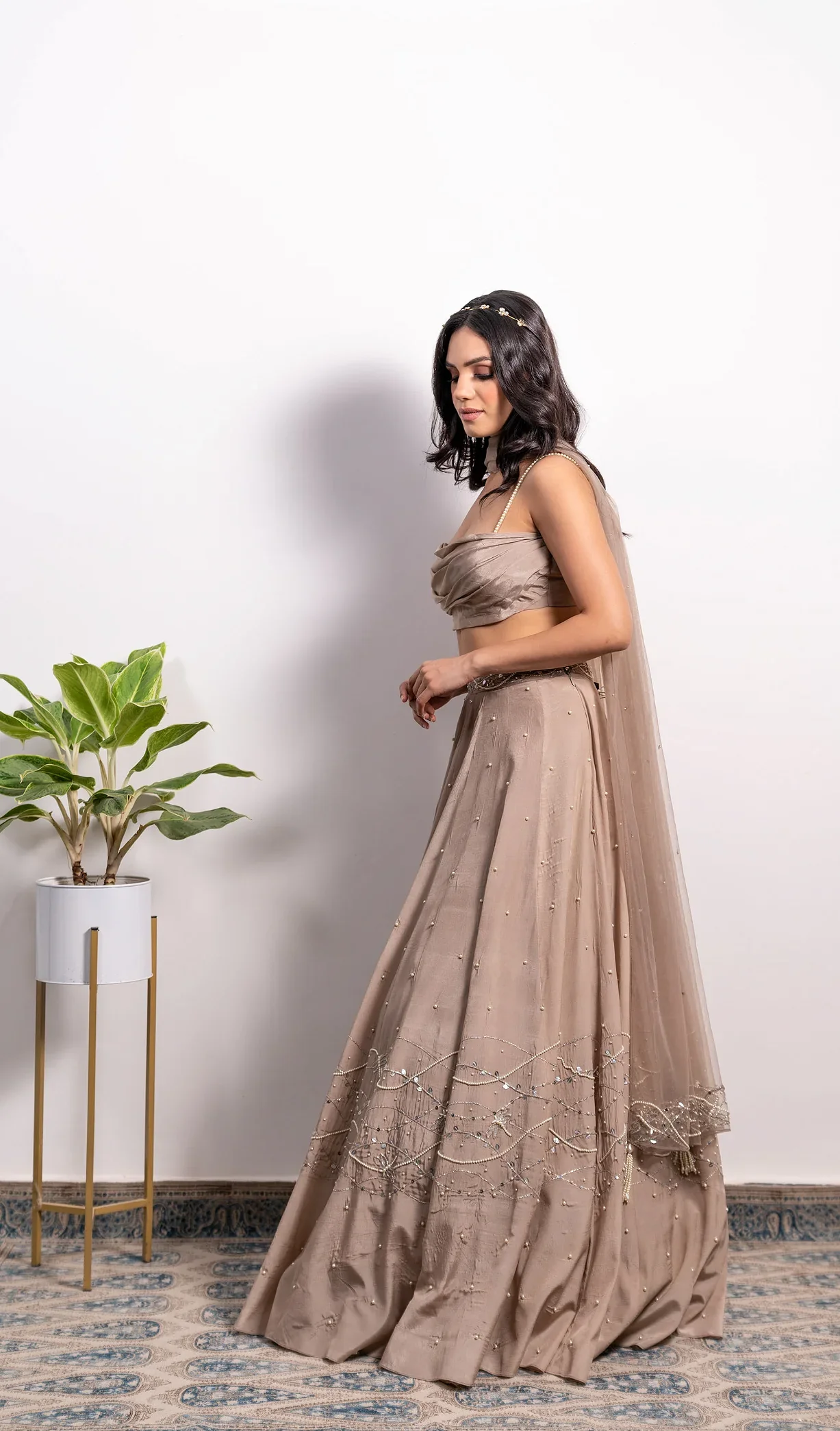 Mouse brown lehenga with pearl, sequin and cutdana embroidery. Comes with a cowl neck blouse and dupatta.