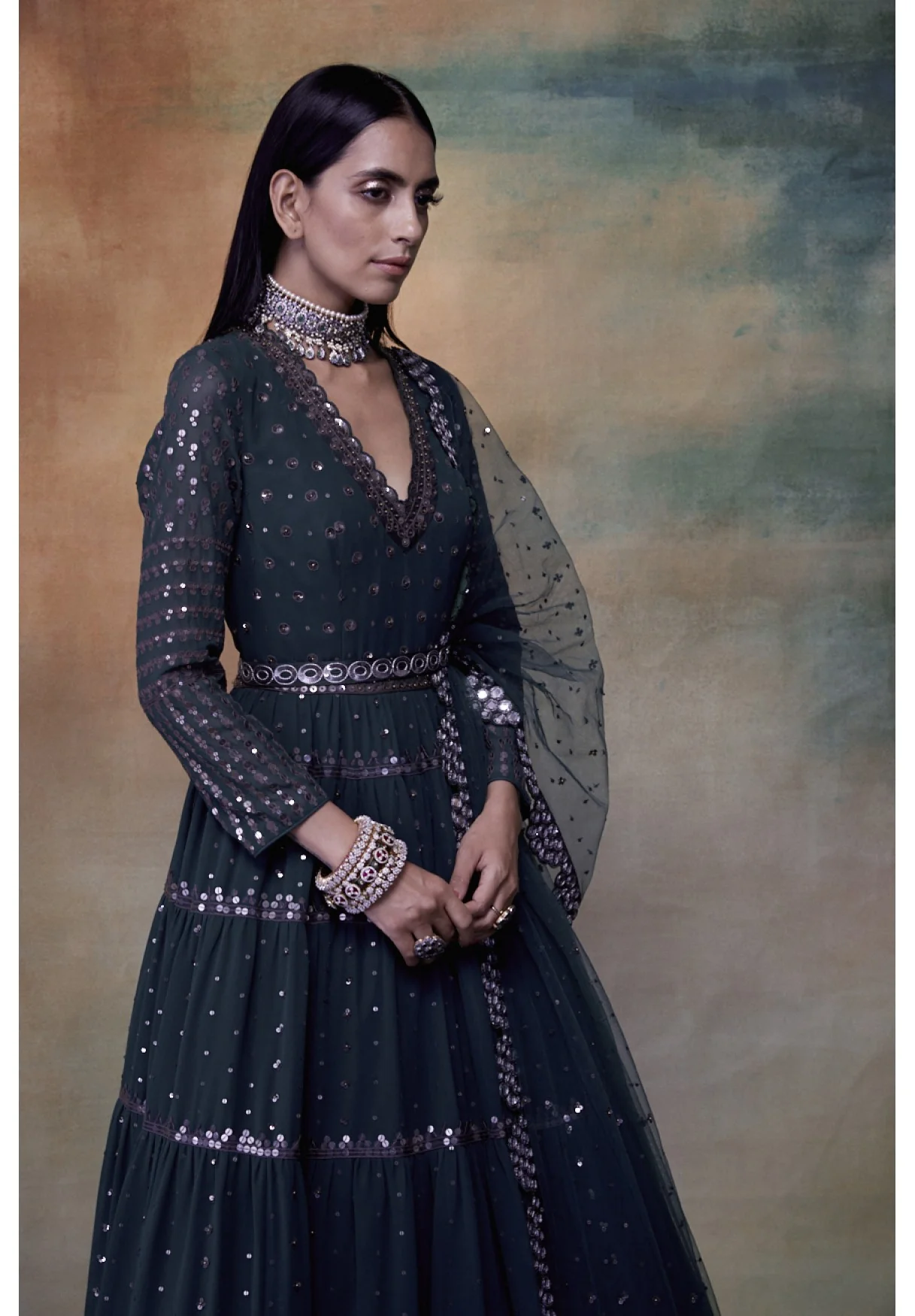 Emerald-tiered Anarkali with sequin embroidery & mirror work. Paired with a net dupatta.