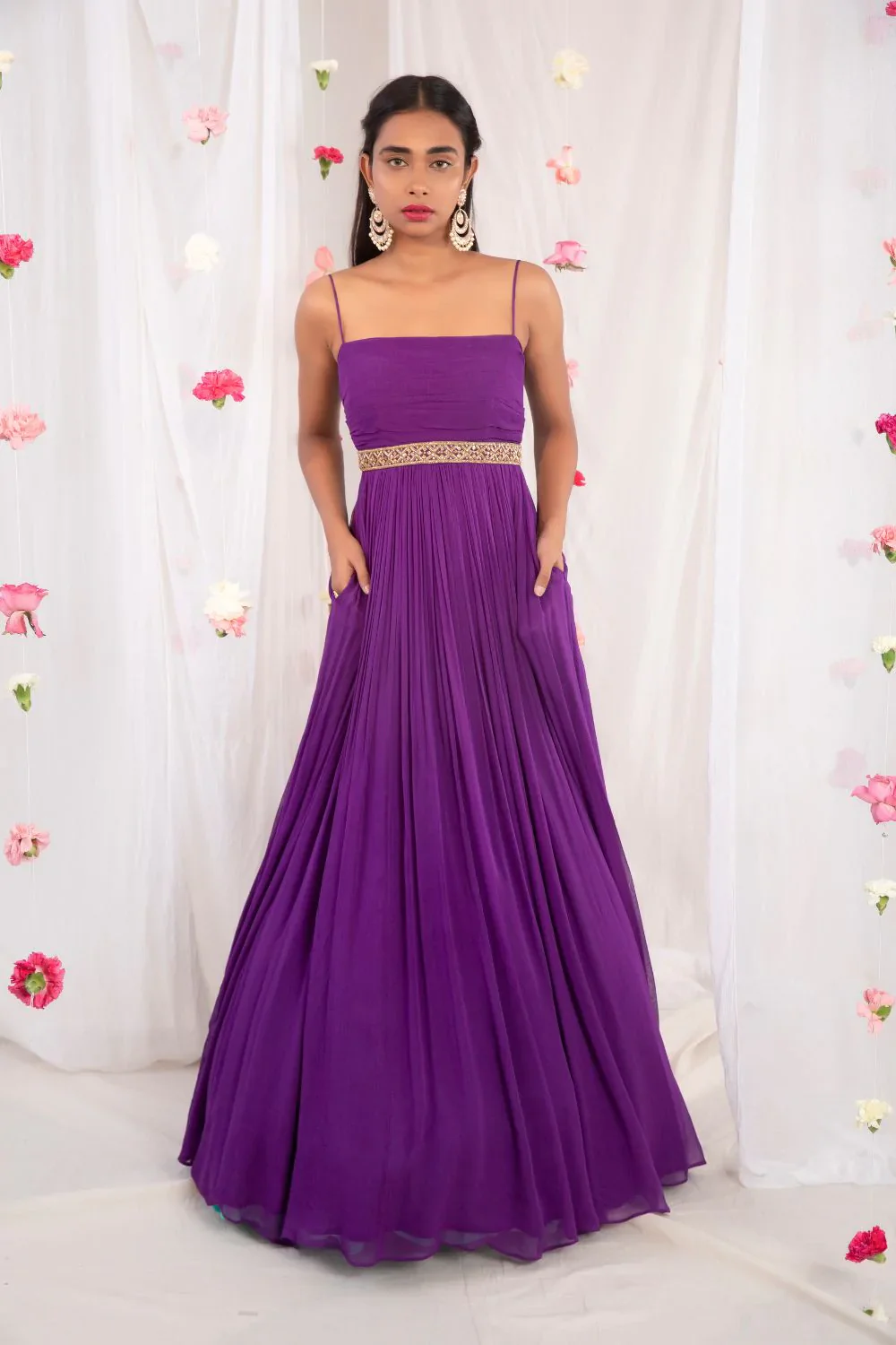 Purple pleated Anarkali in georgette base. Paired with a printed dupatta with a sequin border.