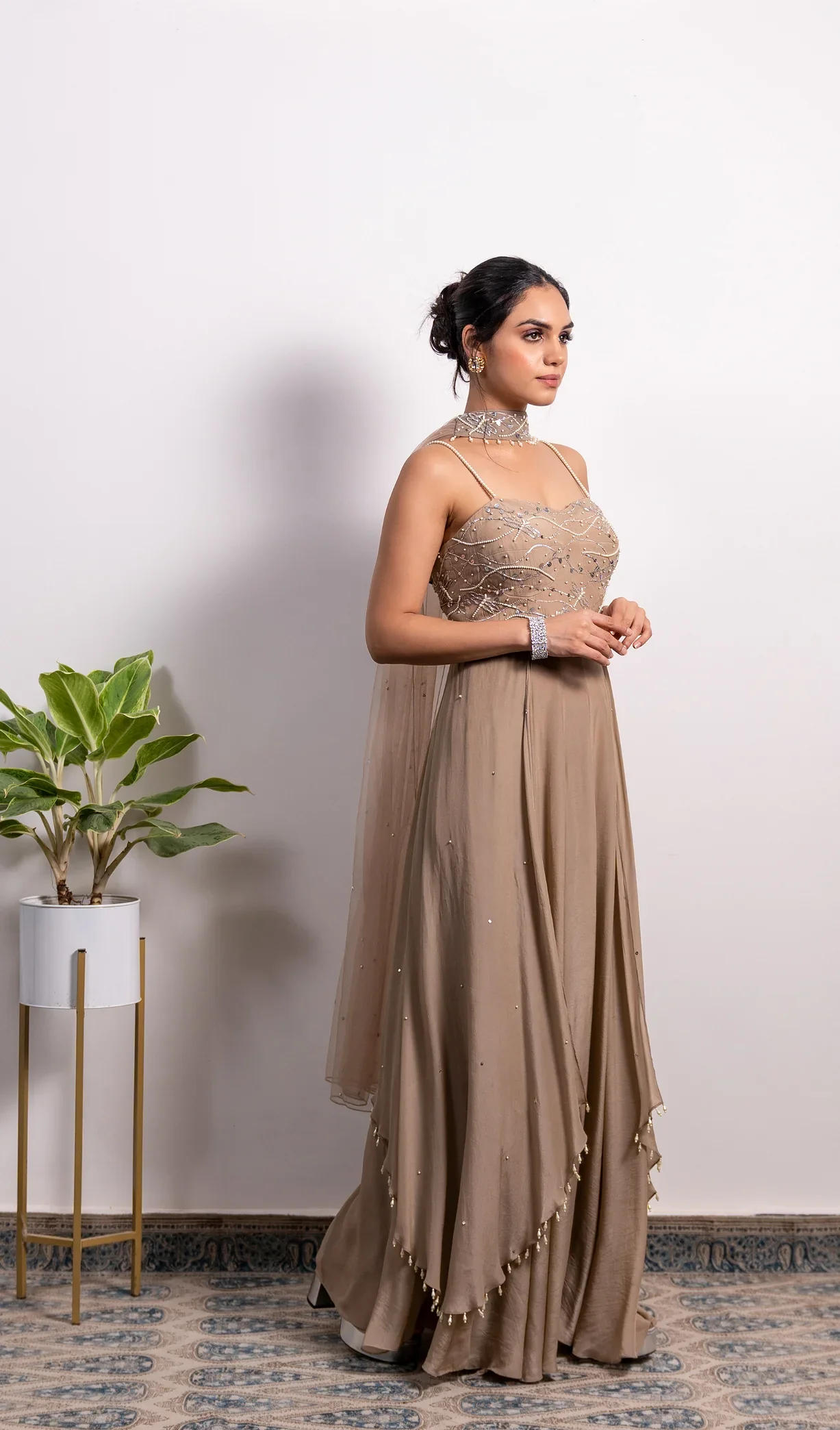 Mouse brown Anarkali with embroidery on the corset-style bodice and layers on the sides. Comes with a dupatta.