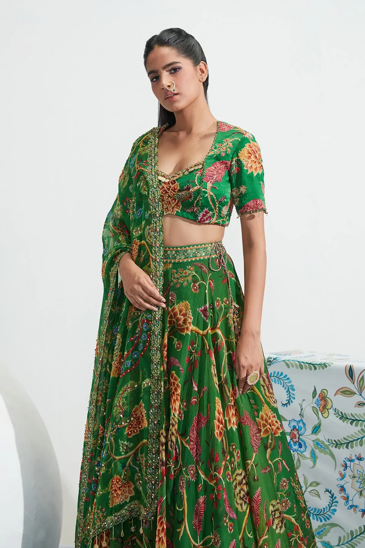 Green organza lehenga with multi-coloured floral prints. Comes with an embroidered blouse & organza dupatta.