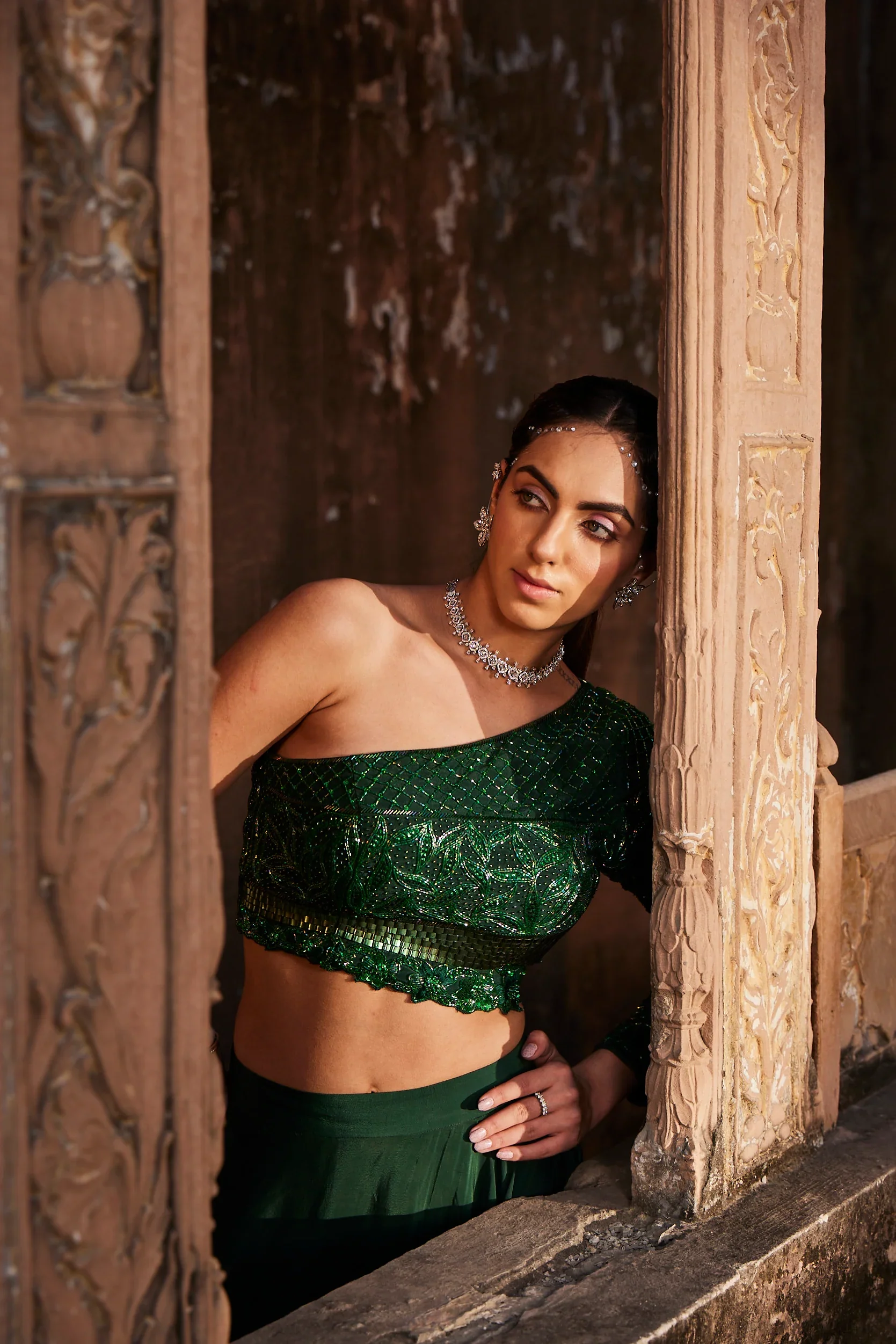 Green one shoulder embroidered choli with asymmetrical skirt.