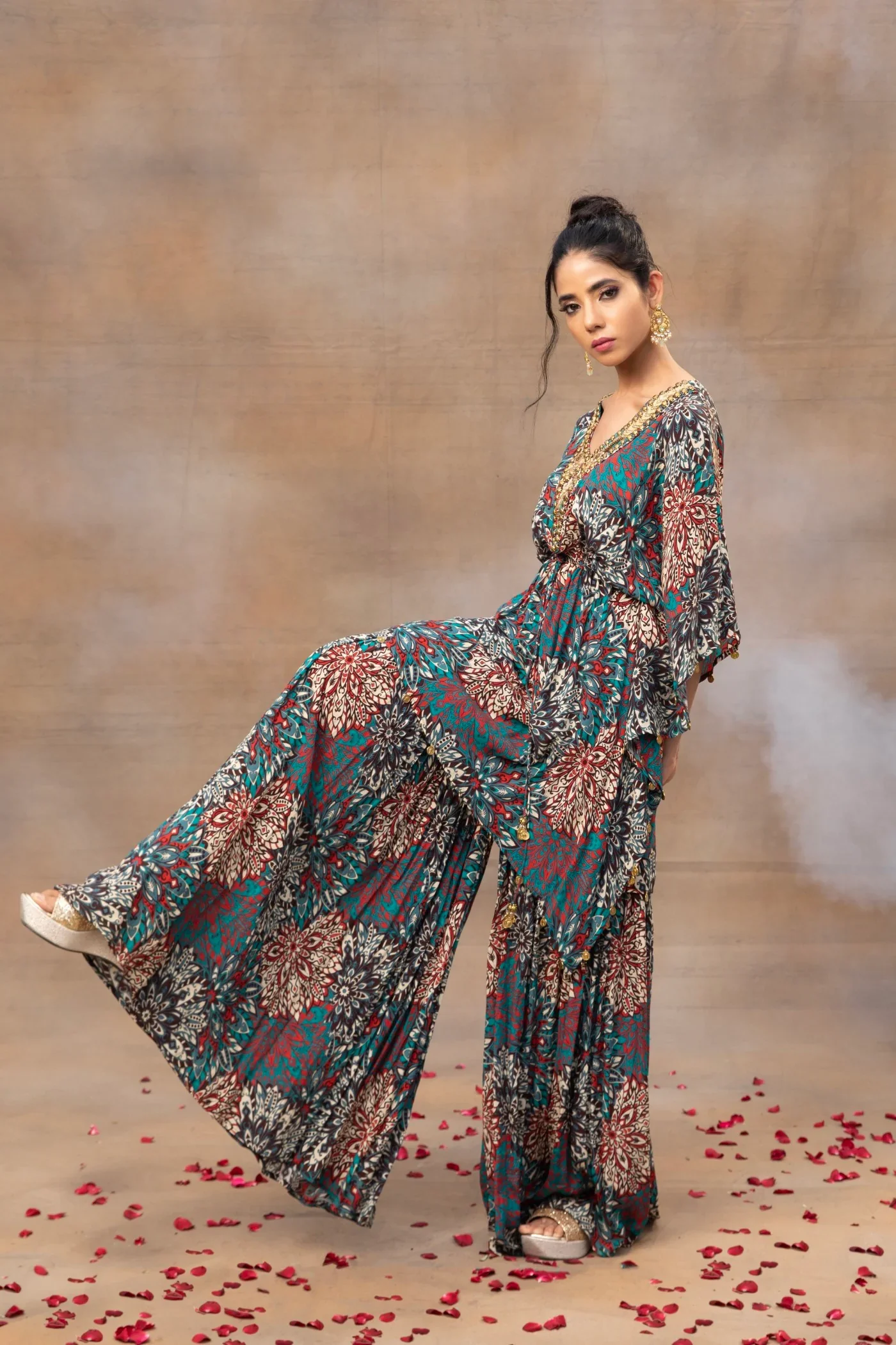 Green Printed Embroidered Kaftan Top With Sharara Set