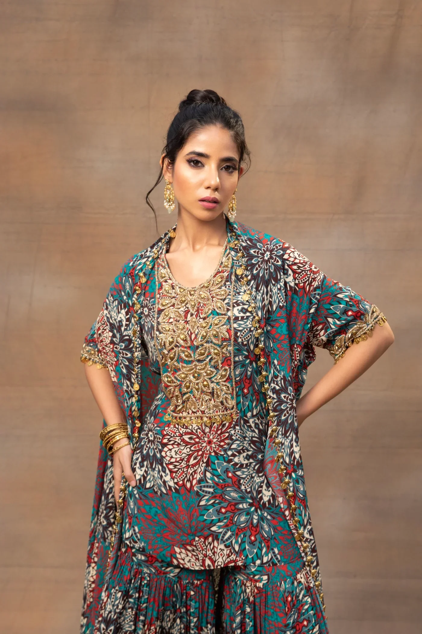 Green Printed Embroidered Short Kurta, Sharara And Cape Set