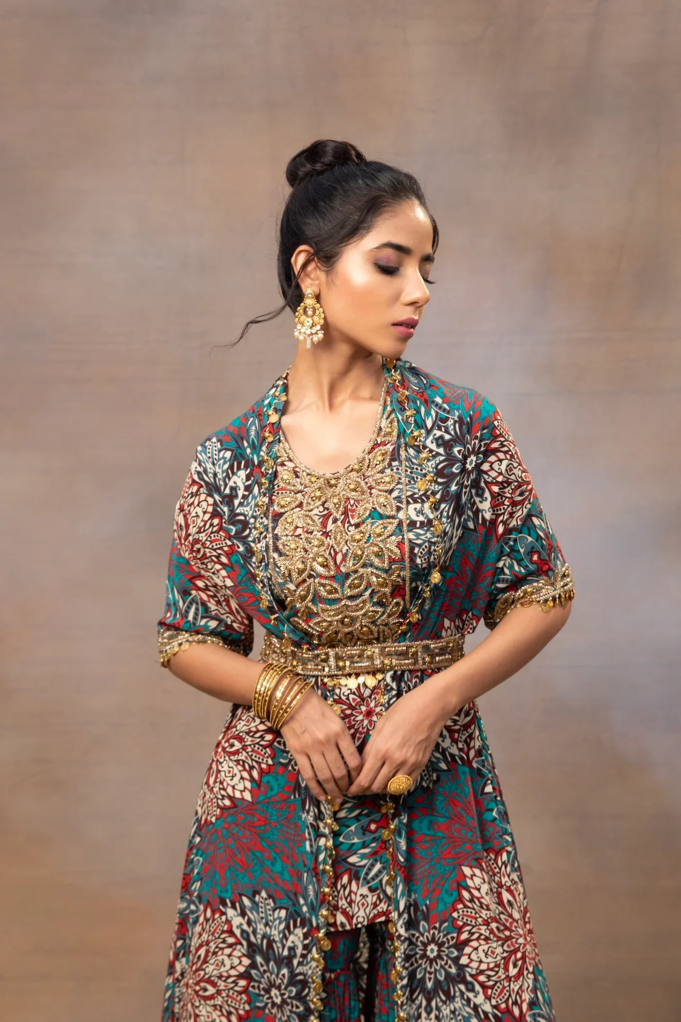 Elevate your style with our stunning green floral printed short kurta ensemble. Adorned with exquisite gold embroidery, this outfit exudes elegance. Paired with flowy sharara pants and a matching cape, both embellished with delicate embroidery and hangings, it's a perfect blend of grace and charm. Complete the look by cinching the waist with our intricately designed embroidered belt, adding a touch of sophistication to your ensemble. Embrace the beauty of tradition and contemporary fashion with this captivating outfit.
