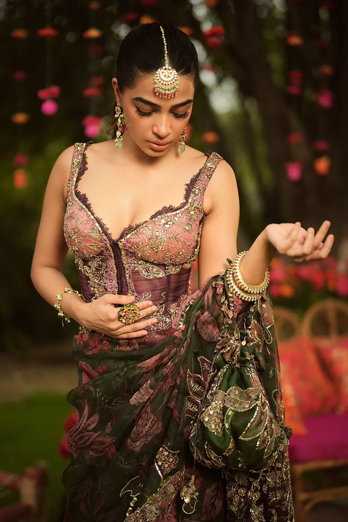 Heavy Hand Embroidered Predated Saree And Corset Blouse With Lace Detailing