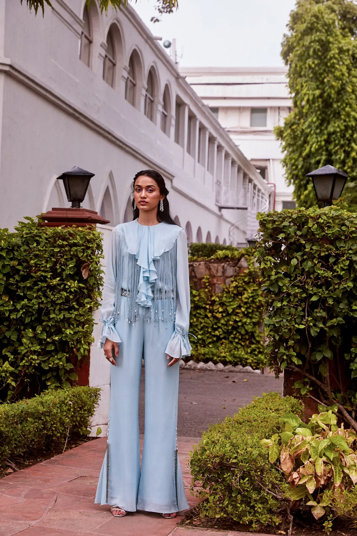 Close neck with ruffles and fringes. It has balloon sleeves and slit palazzo with embroidery at the slits and the belt.