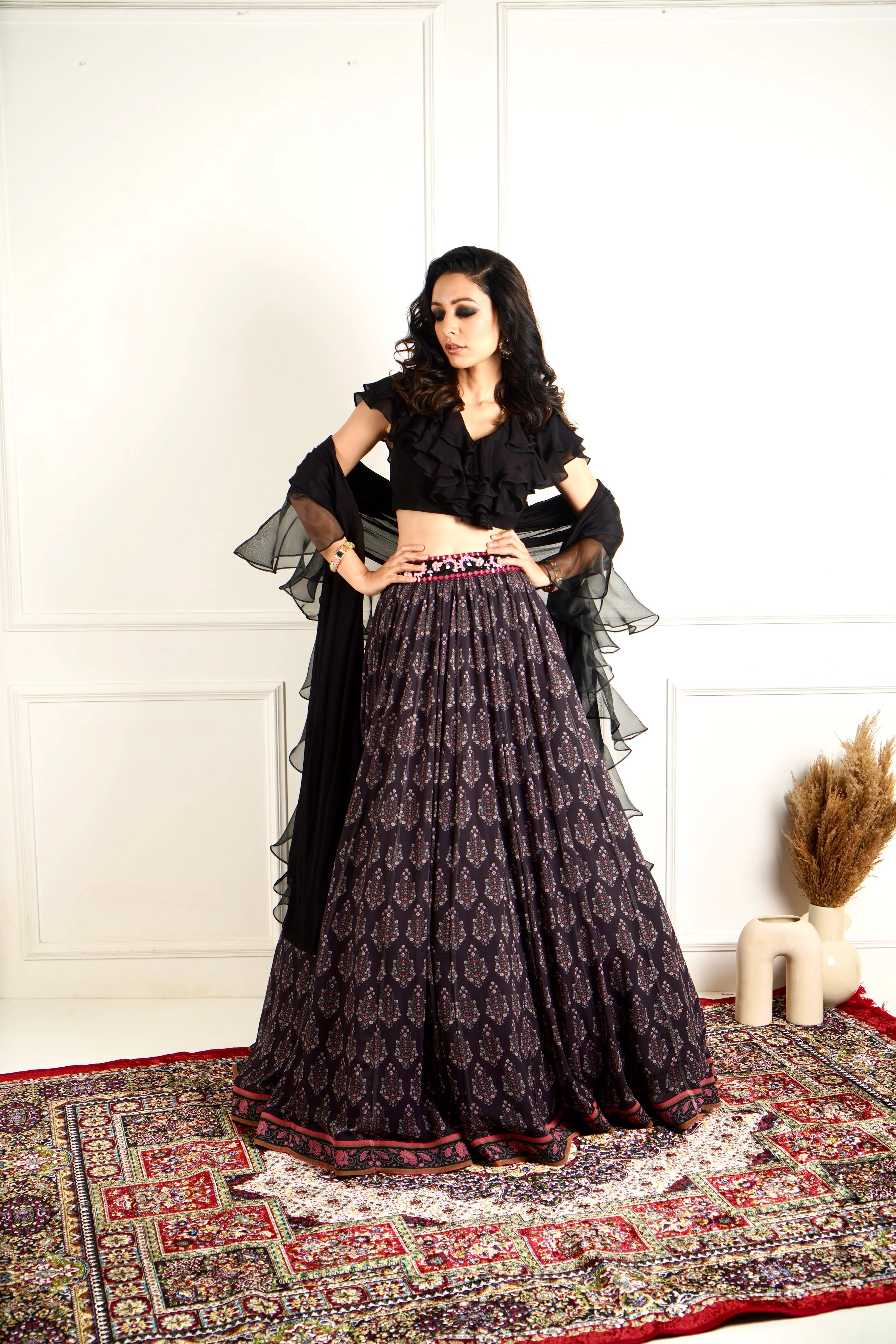 Black Chiffon ruffled blouse paired with Damask Printed Chiffon Lehenga and Ruffled Dupatta