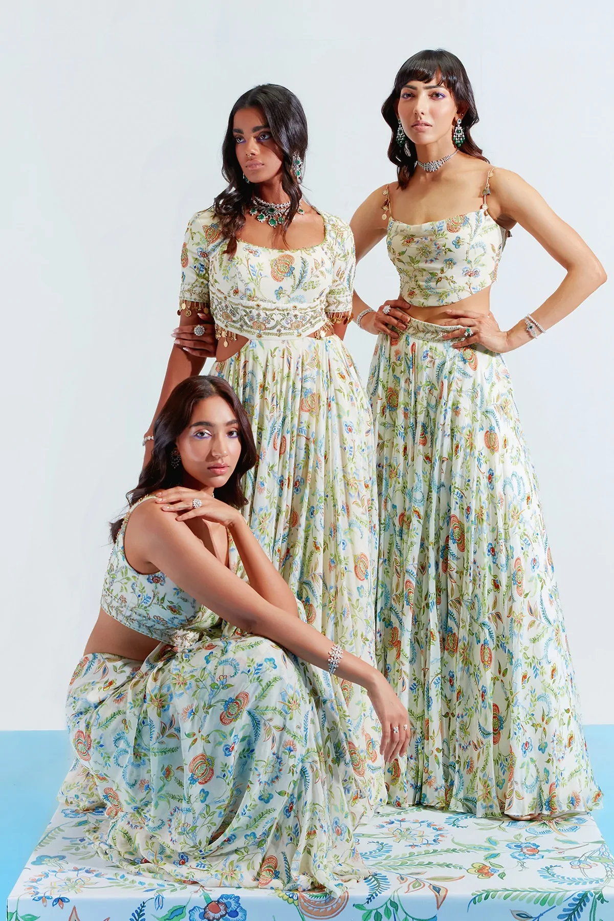 Ivory lehenga with multi-colour floral prints. Comes with a printed blouse & dupatta.