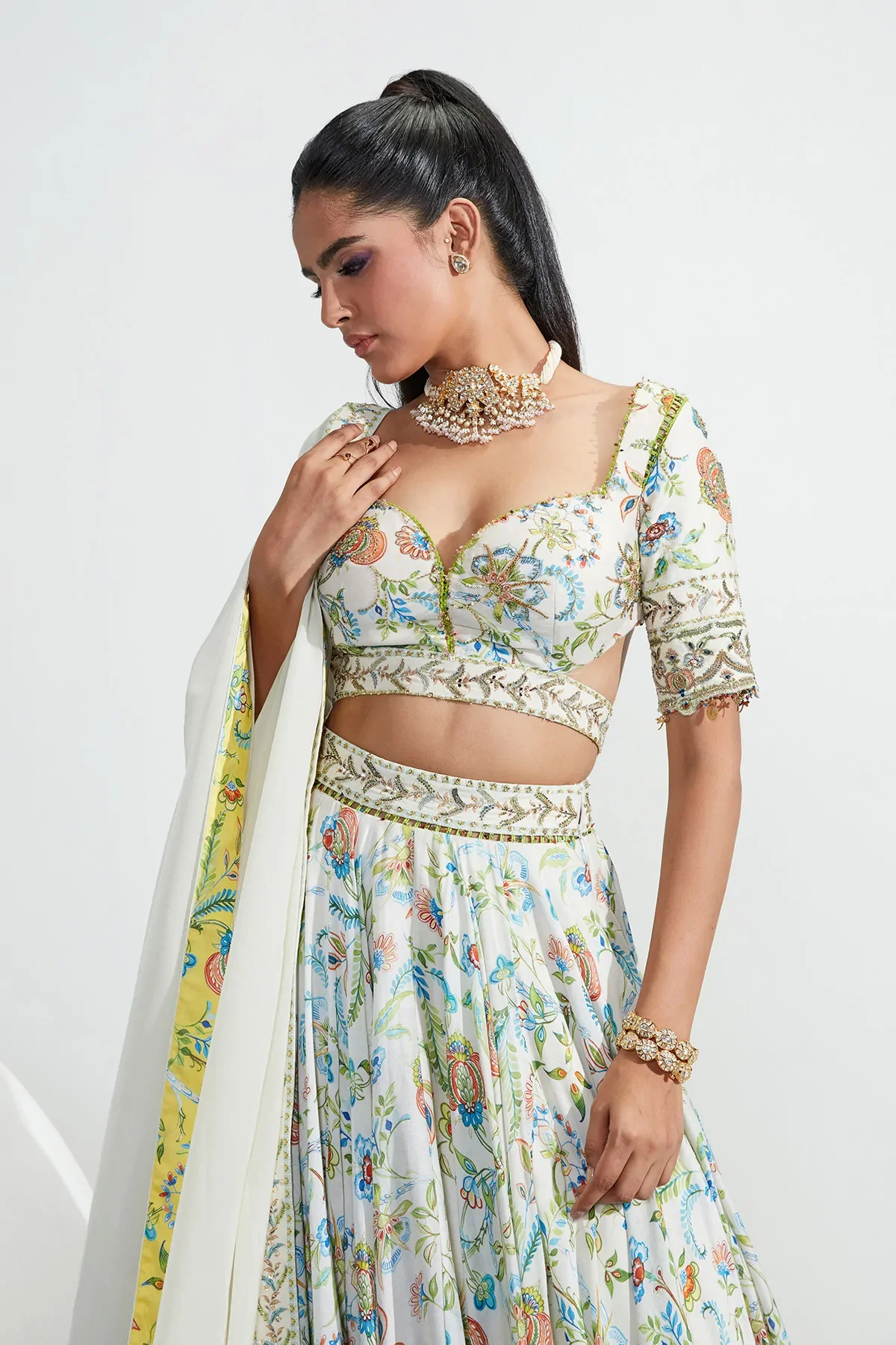 Ivory chanderi silk lehenga with multi-colour floral prints. Comes with a blouse & organza dupatta.