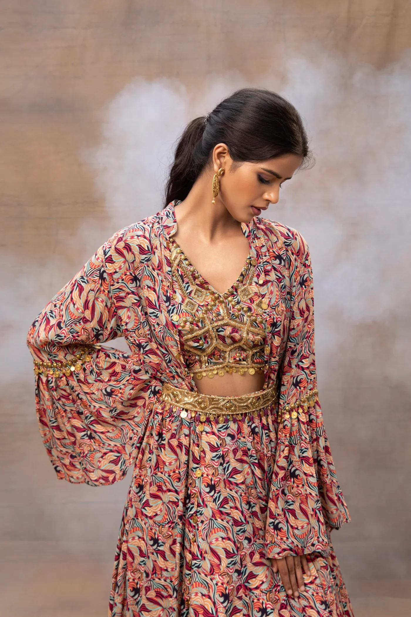 Introducing our exquisite Ivory Geometric Printed Choli Lehengas and Cape Set, a true masterpiece of elegance and style. The ensemble features an embroidered belt that beautifully cinches the waist, enhancing your curves with grace. The cape sleeves boast intricate pleats detailing, adding a touch of sophistication to your look. Adorned with delicate hangings on the choli and exquisite gold embroidery throughout, this ensemble promises to make you the center of attention at any special occasion. Step into the spotlight with this captivating outfit and leave a lasting impression.