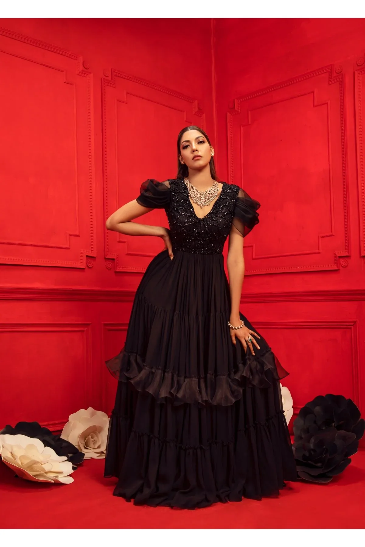 Black layered gown with intricately embroidered yoke, V-neckline, ruffle sleeves and gathers at the waist.
