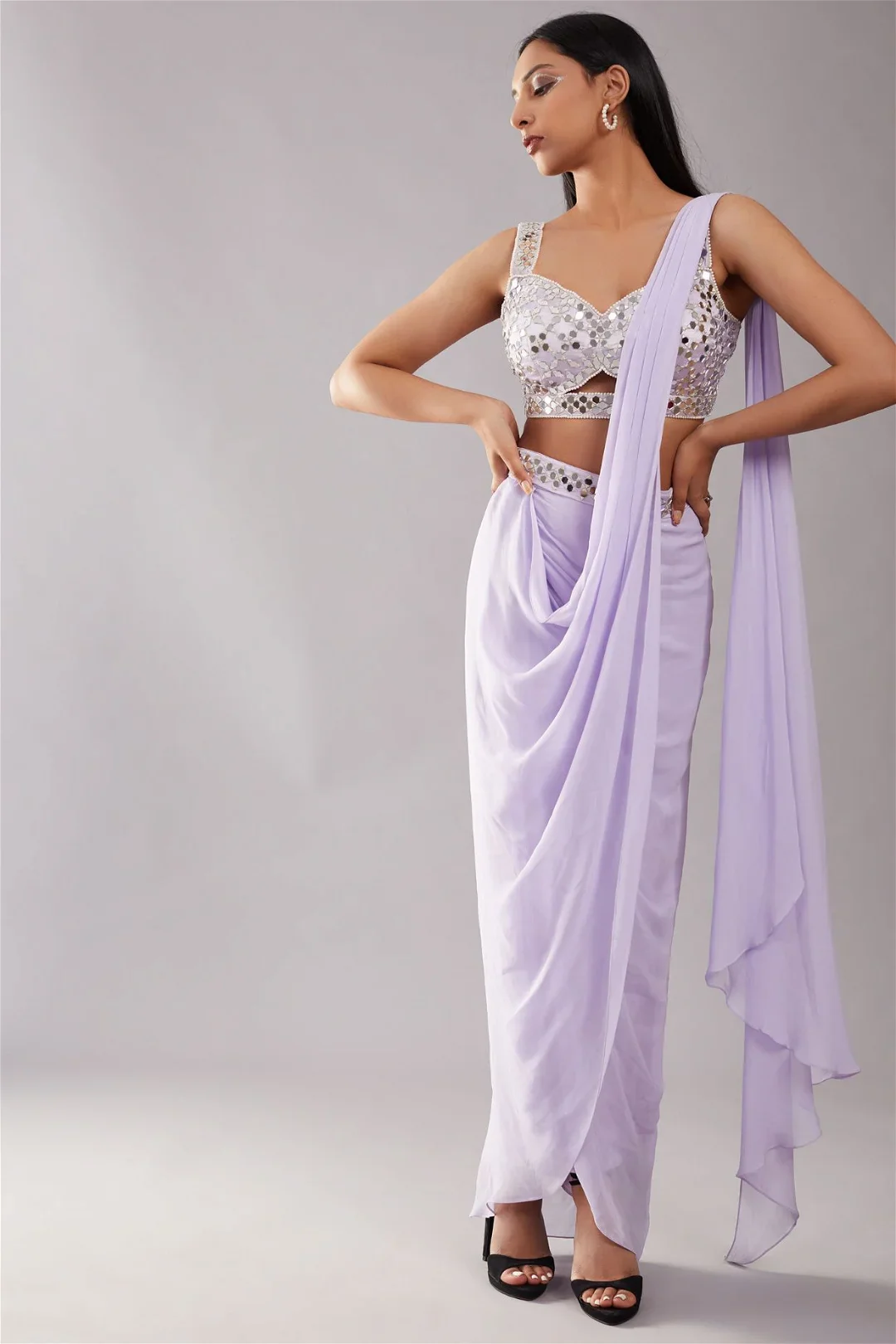 Lilac draped saree paired with mirror & pearl embroidered sleeveless scallop blouse. Comes with mirror embellished belt.