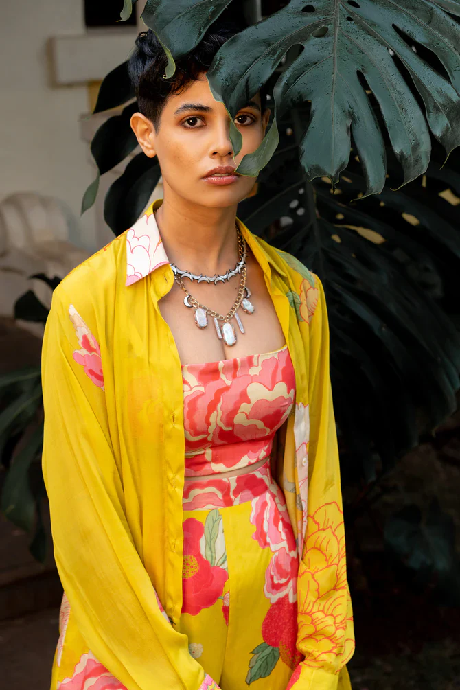 The lime yellow big floral co-ord set is inspired from fresh blooming spring flowers.