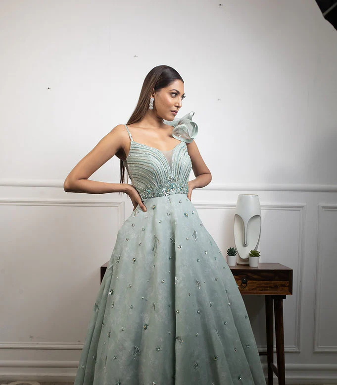 Gown with perfect flair and a ruffle detail on shoulder. Its minimal and has a perfect amount of detailing.