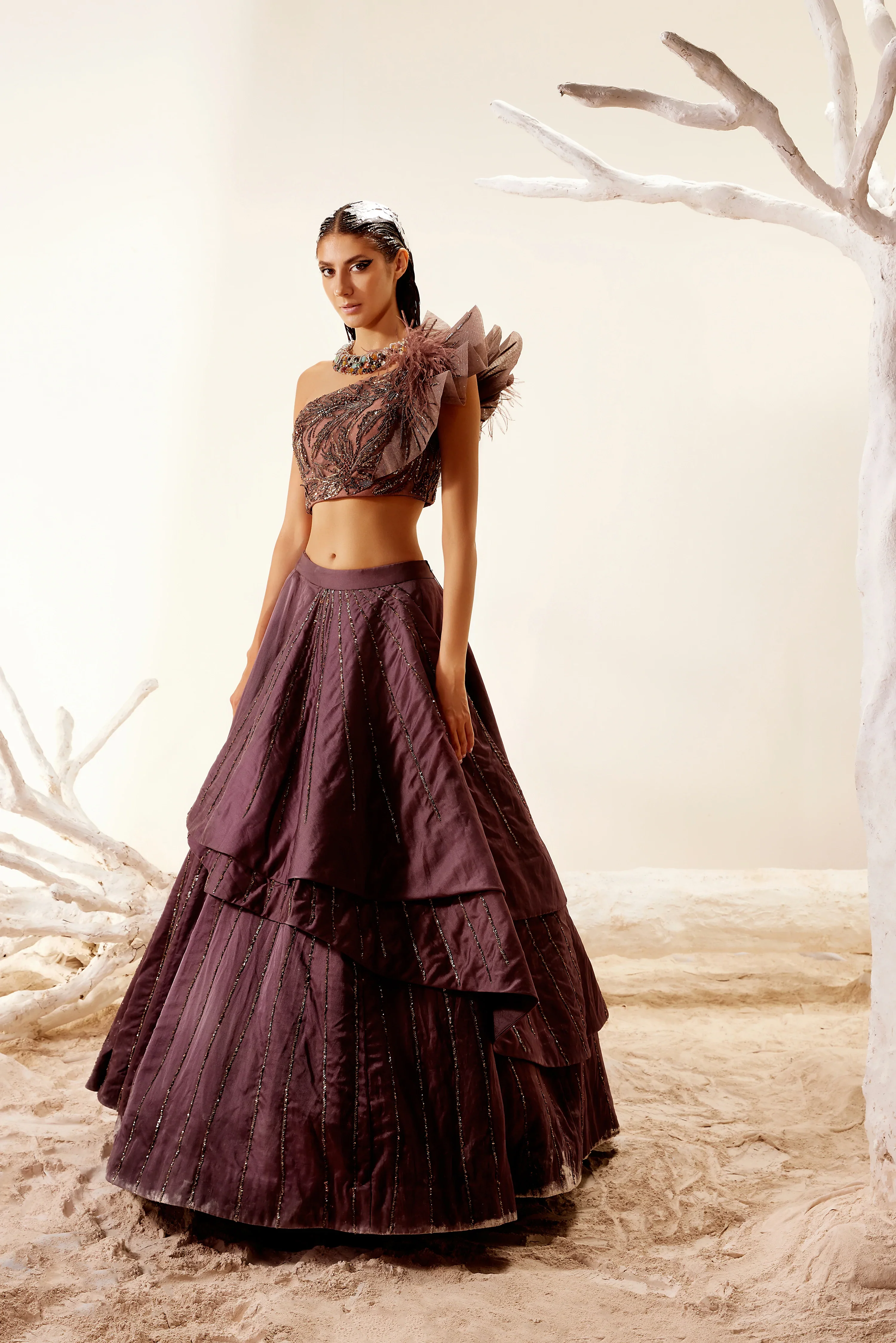 Purple layered skirt style lehenga with linear embroidery. Paired with a one-shoulder blouse with floral embroidery spiked shoulder detail & ruffle dupatta.