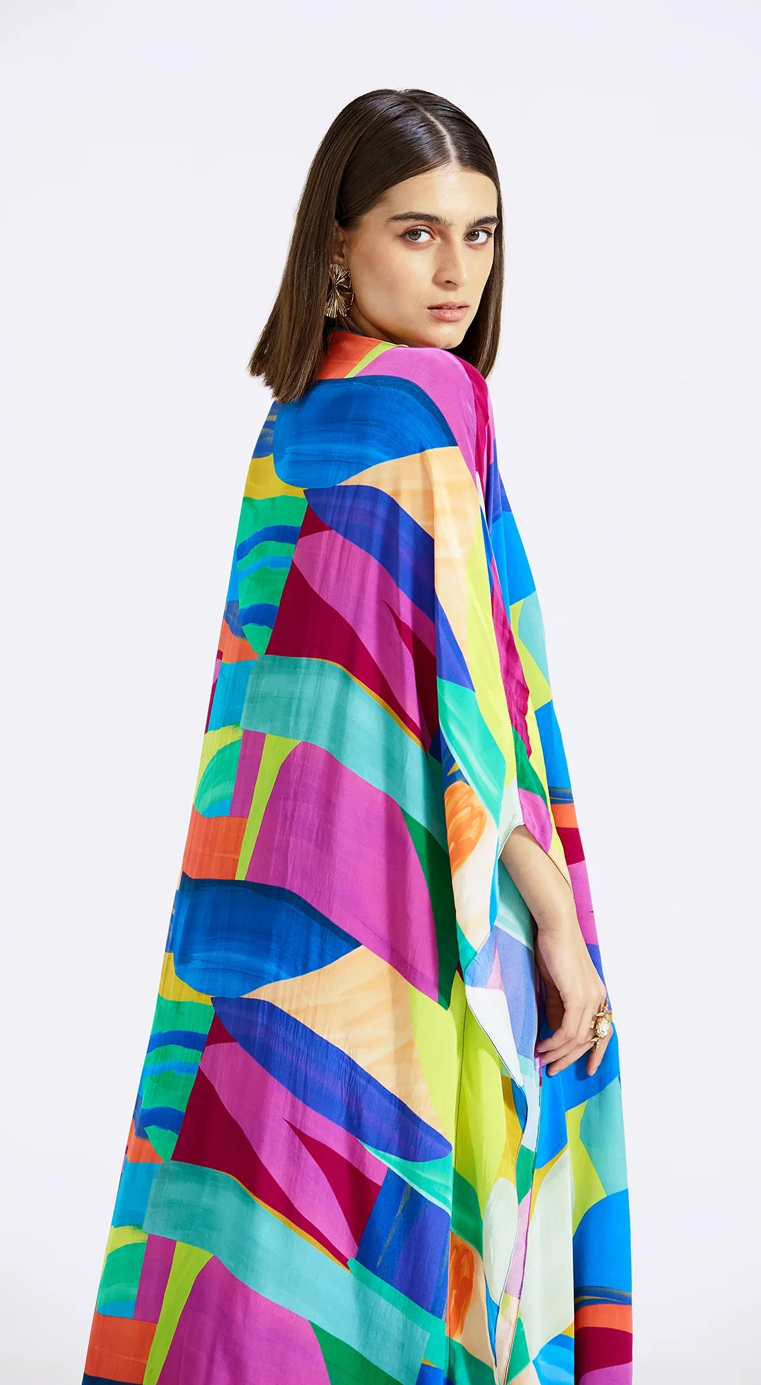 Layered with a flowy cape, this multicoloured skirt set crafted in crepe features a skirt and a blouse with abstract prints and intricate handwork on the borders, hemline and waist belt.