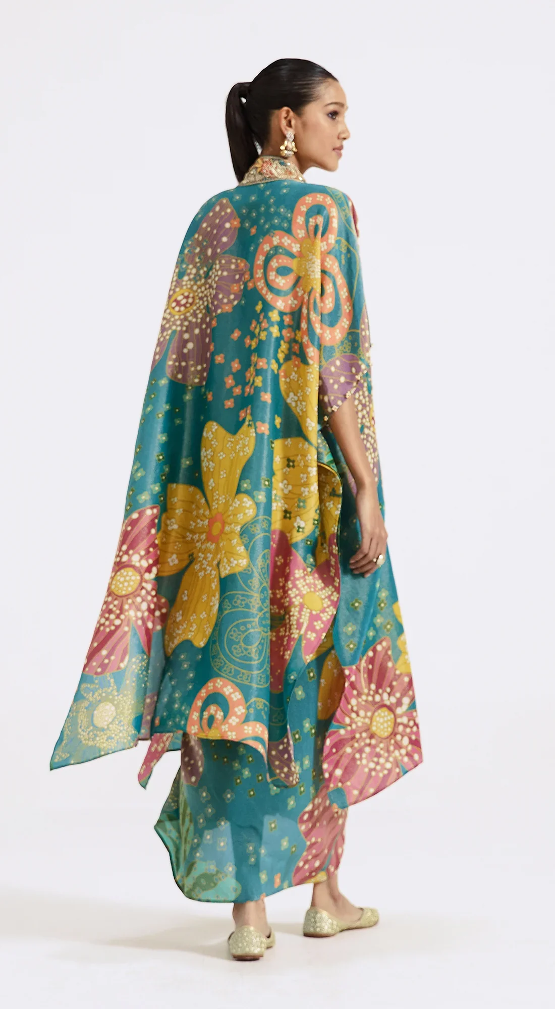 A burst of colour adorns this multi-hued skirt set made from tissue fabric. Featuring a corset blouse, asymmetric jacket and a skirt, it is embroidered with zardozi and embellished with sequins as well as beads accentuating the perfect abstract patterns.