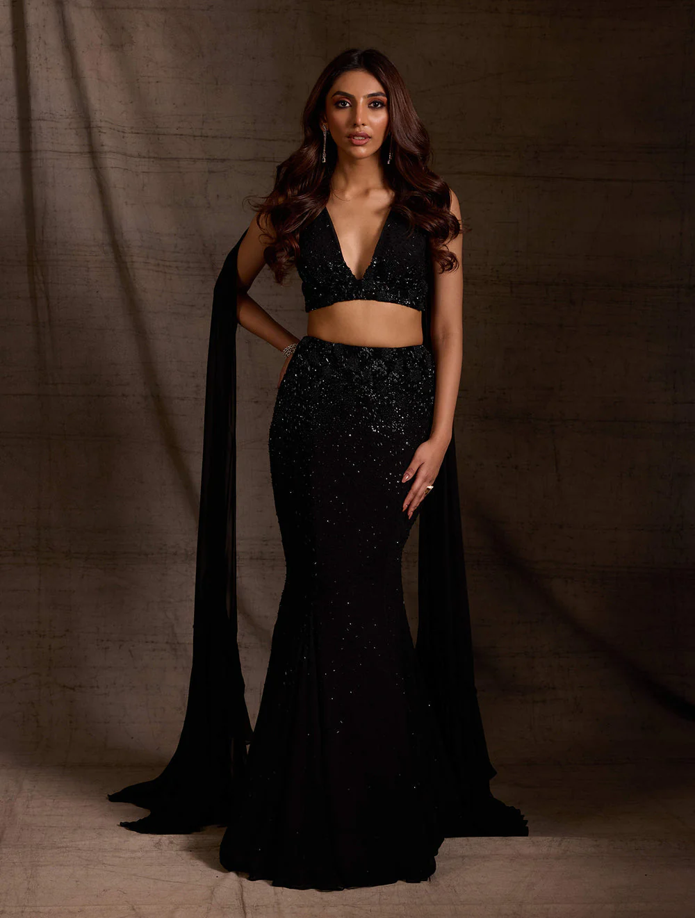 Black skirt hand embellished with tonal hand embroidery with mixed sparkling materials in a dense to light format, paired with a matching embellished plunge neck blouse with an open adjustable tie back. The outfit is completed with drapes attached to the shoulder with ruffles at the hem.