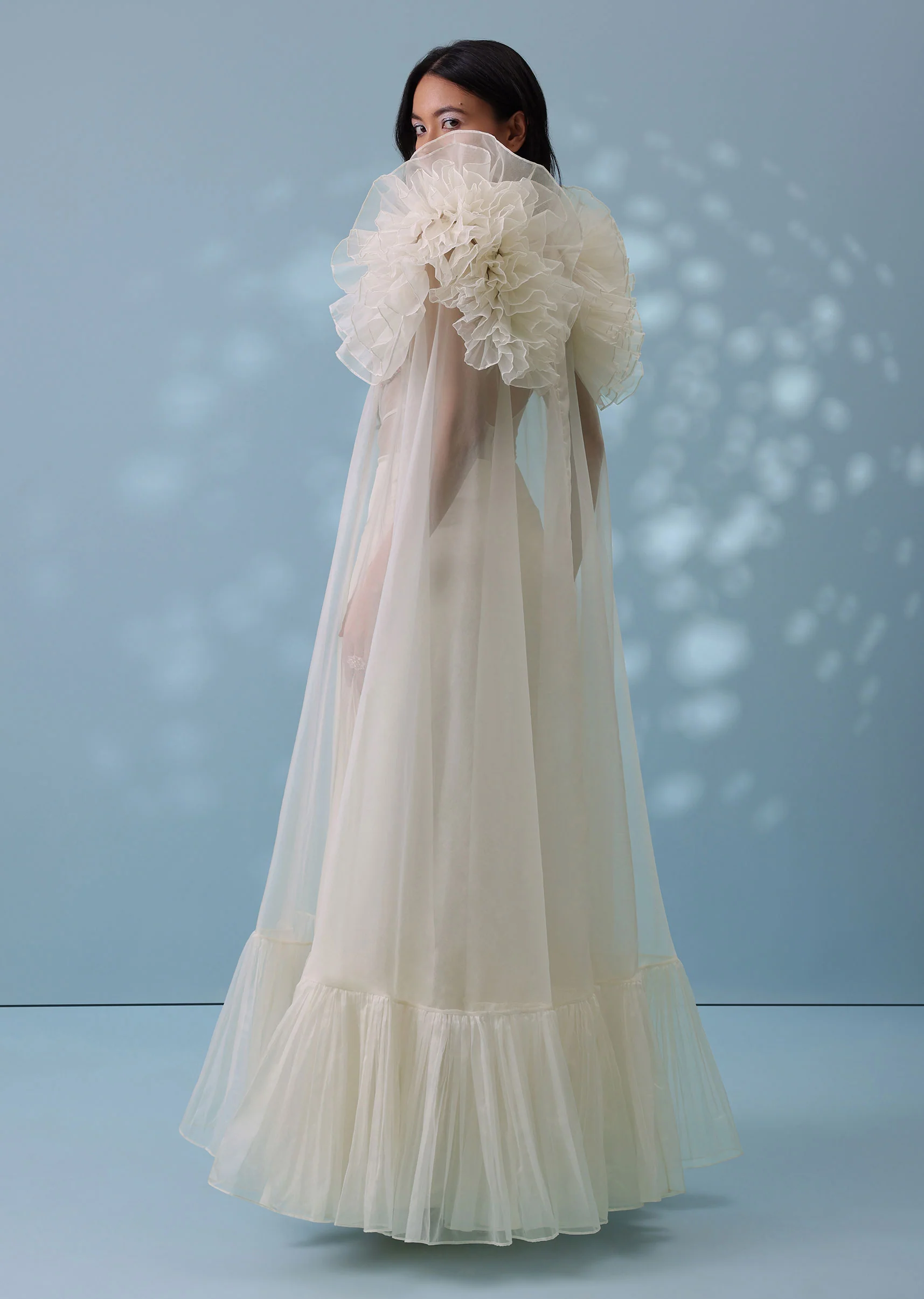 - The outfit is complemented with a dramatic and queenly ruffle sleeves long shrug.