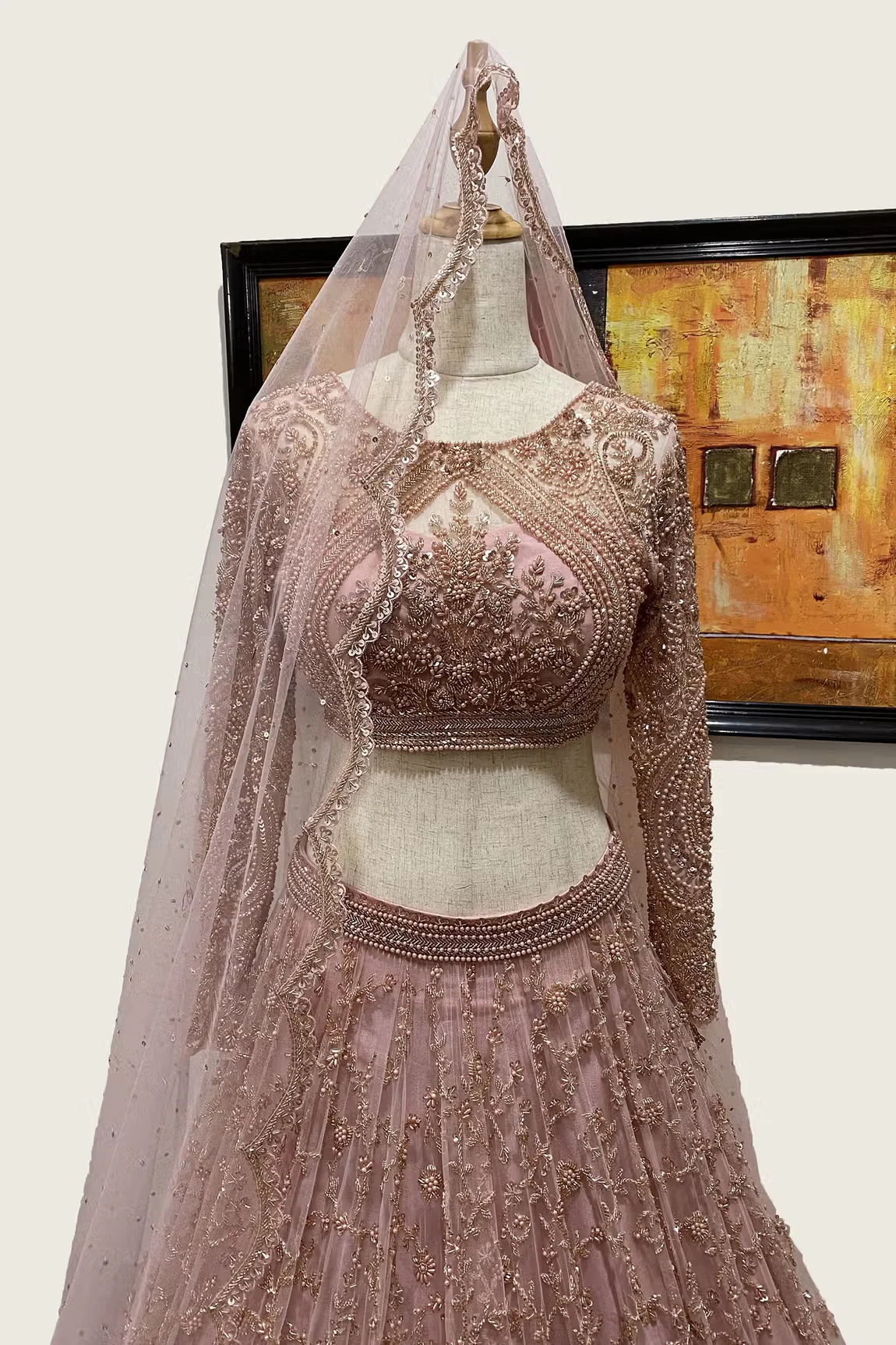 Dirty rose lehenga with all-over pearl, nalki, cutdana and sequin embroidery. Comes with full sleeves blouse and dupatta.