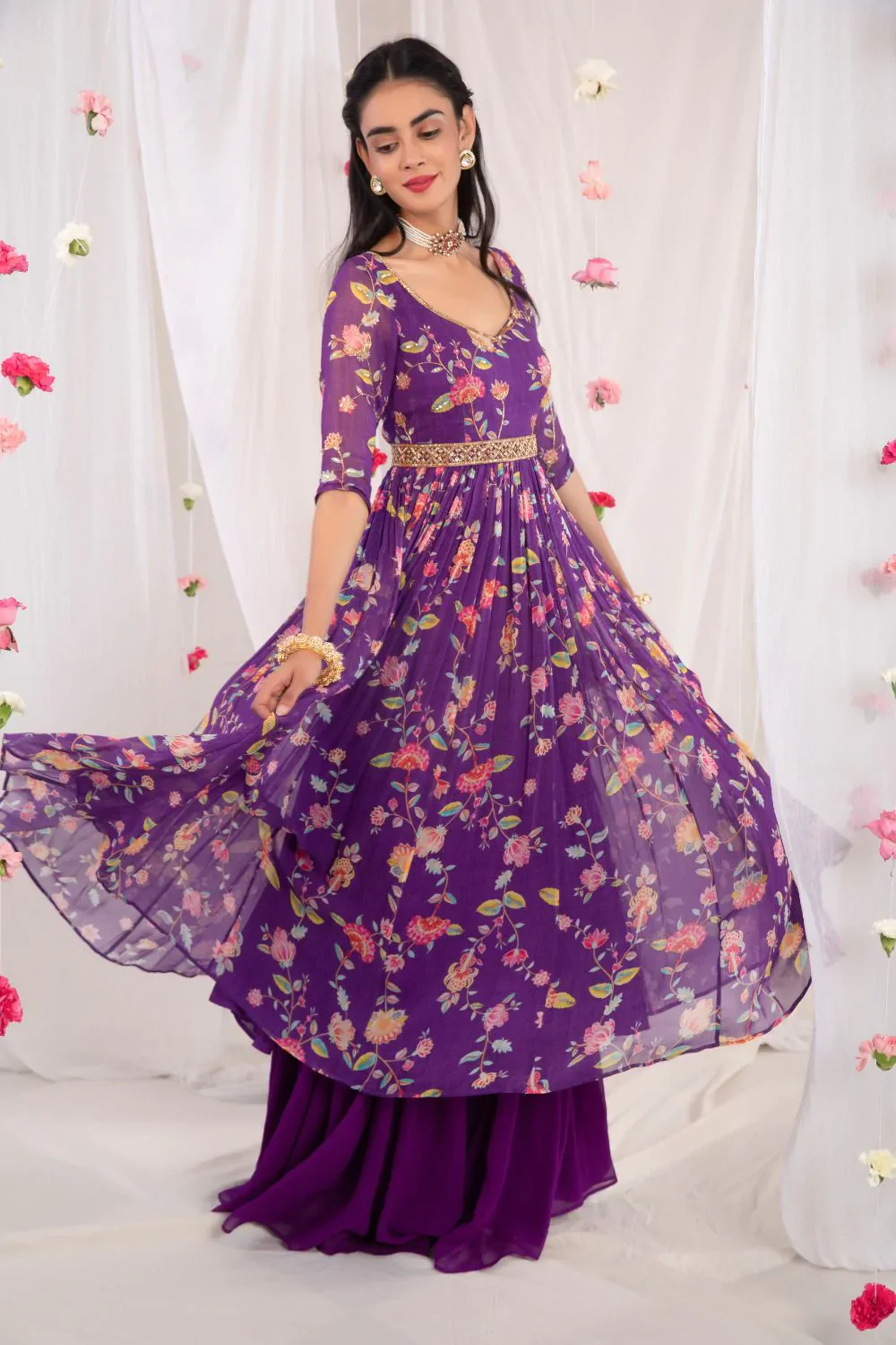 Purple Anarkali in georgette base embellished with cutdana & sequins with floral printed motifs. Paired with sharara & embellished dupatta in organza base. Comes with an organza embellished belt.