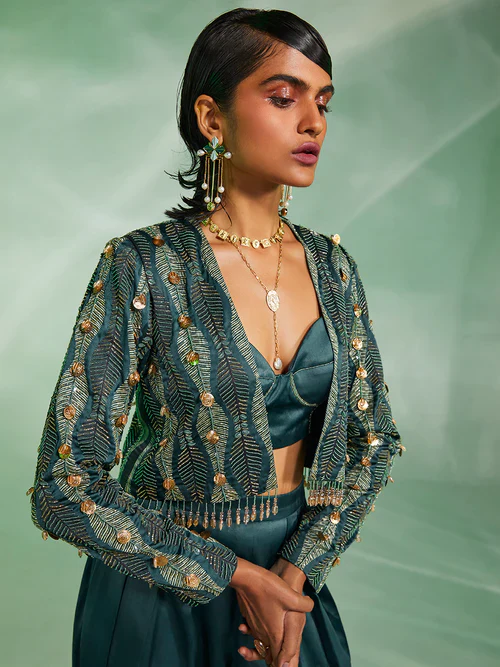 Bringing ethereal and theatrical complexities through Romy set offering timeless composition of hand-embellished sleek jacket, pleated pants, and hand highllighted bustier.