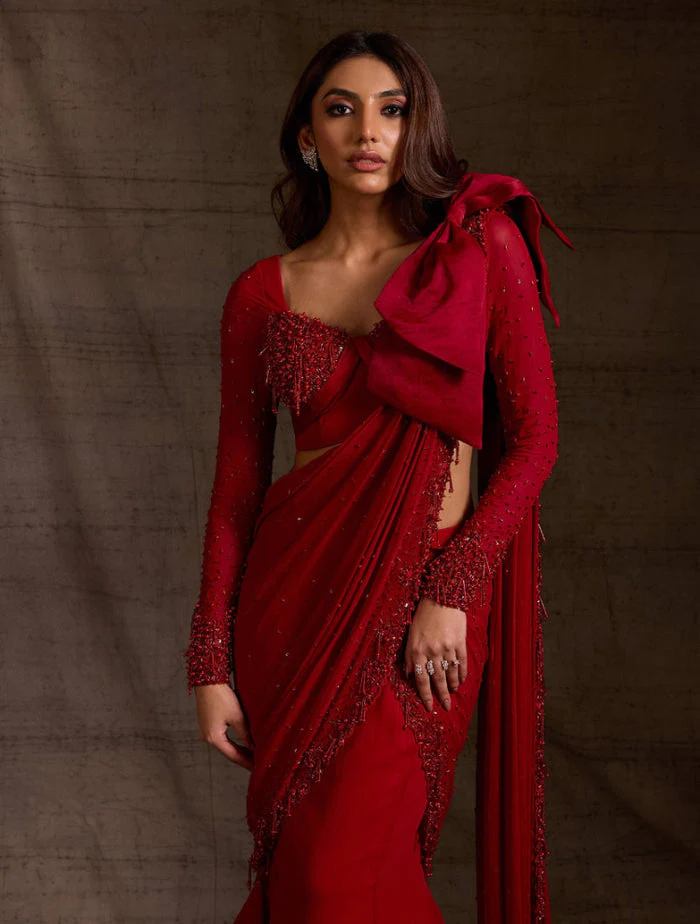 Scarlet Red fishtail sari featuring an attached pre-pleated pallu with tonal pearl & glass beaded embellishment, paired with a corset stylisted blouse with placement embroidery. The sari comes with an oversized detachable satin-organza bow.