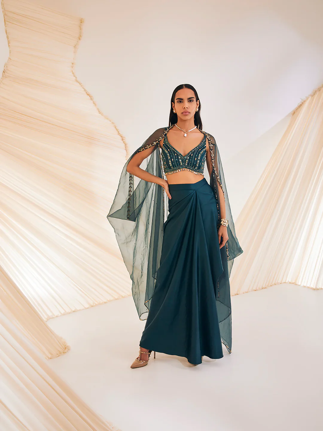 Our Vivien cape set offers feminine flowy skirt, and blouse adorned with tassels. The silky organza cape with dainty embellishments is another opulent factor of the set.